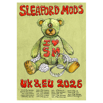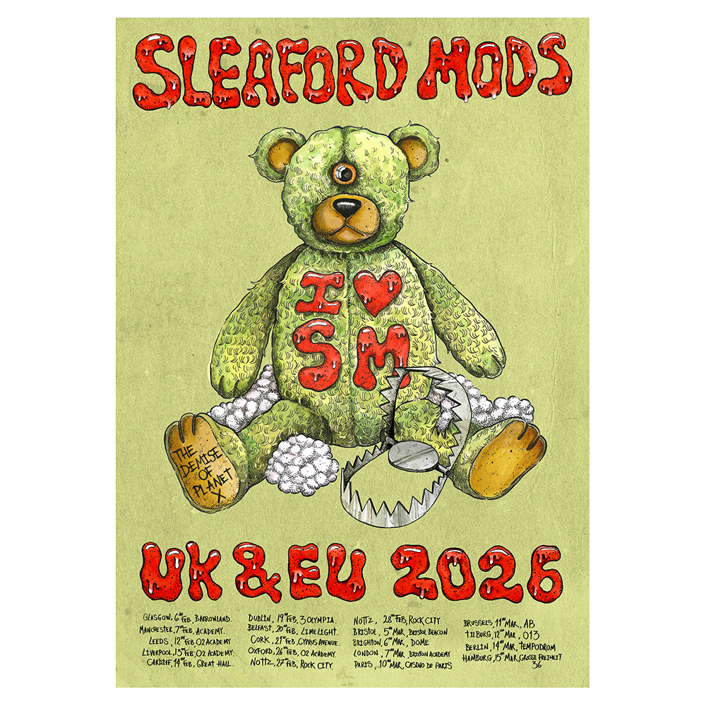 Limited edition print, as seen on Sleaford Mods' 2026 UK & EU tour, featuring The Demise Of Planet X teddy and full tour dates.