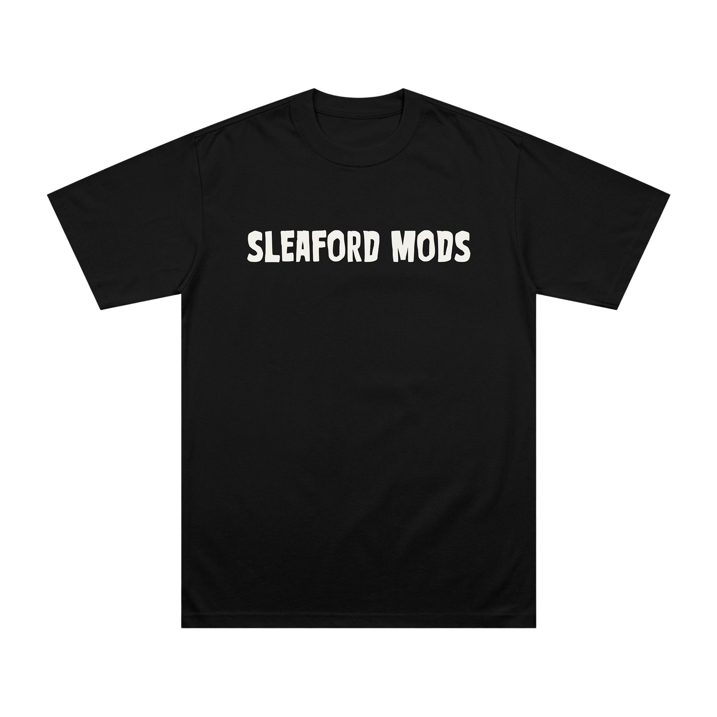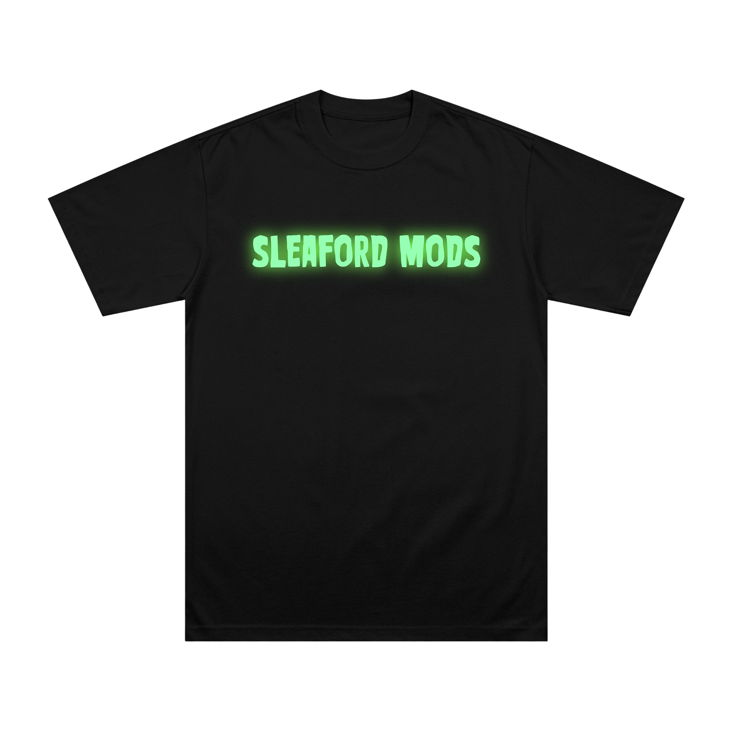 Classic black t-shirt with glow in the dark 'Sleaford Mods' logo front and centre.