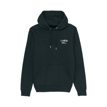 GRIM PILL black hoodie with distressed chest logo print and back 'GRIM PILL' print.